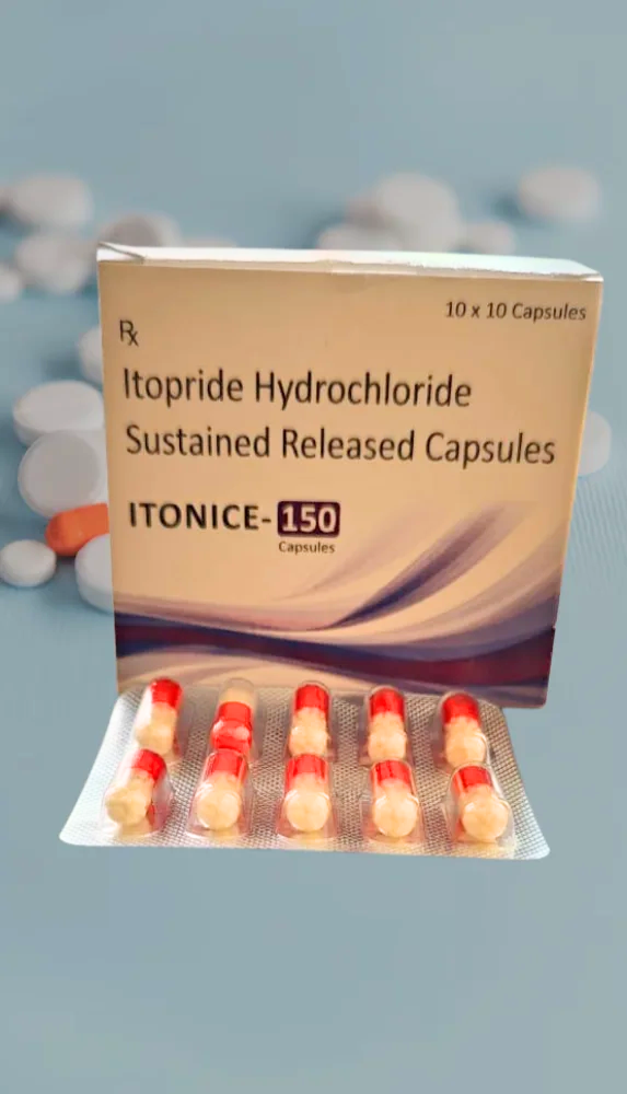 ITONICE-150 Capsules by Kavamed Life Sciences contain Itopride Hydrochloride (Sustained Release), specially designed to support better gastric motility and provide long-lasting relief from functional dyspepsia and gastrointestinal discomfort, ensuring quality and patient safety.