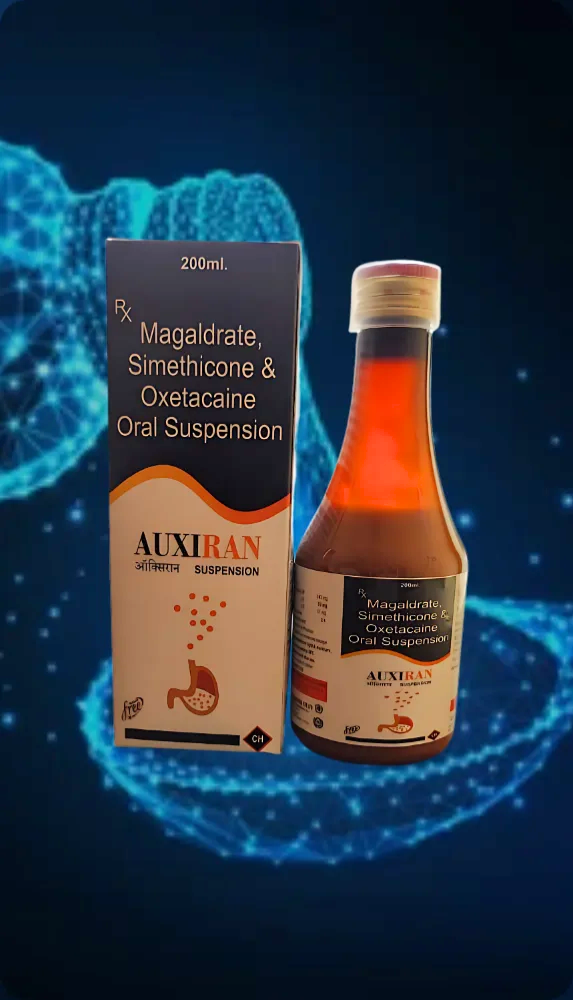 Auxiran Suspension by Kavamed Life Sciences is formulated with Magaldrate, Simethicone, and Oxetacaine to provide fast and effective relief from acidity, gas, heartburn, and ulcer-related pain, ensuring trusted quality and patient safety.